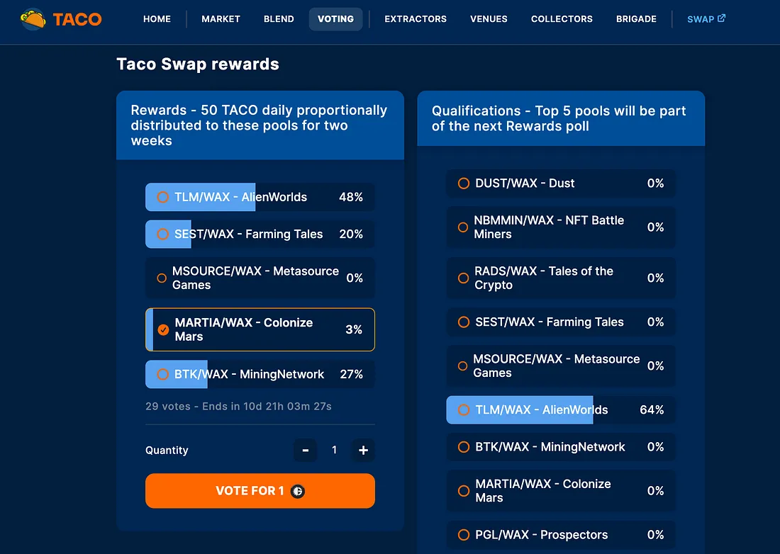 * [TACOG](https://whitepaper.tacostudios.io/tokenomics/tacog) holders can use their TACOG to vote the tokens they want to receive extra rewards for the associated TOKEN/WAX Liquidity Pools